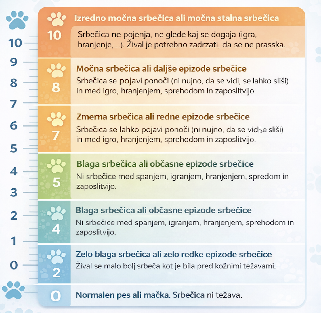 • 10 – zelo intenzivna srbečica, žival se stalno praska ne glede na okoliščine